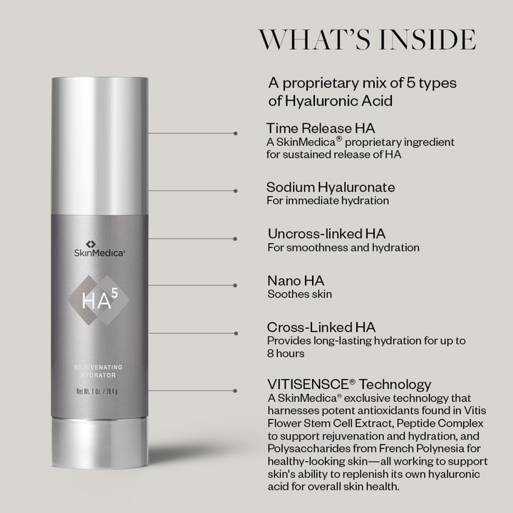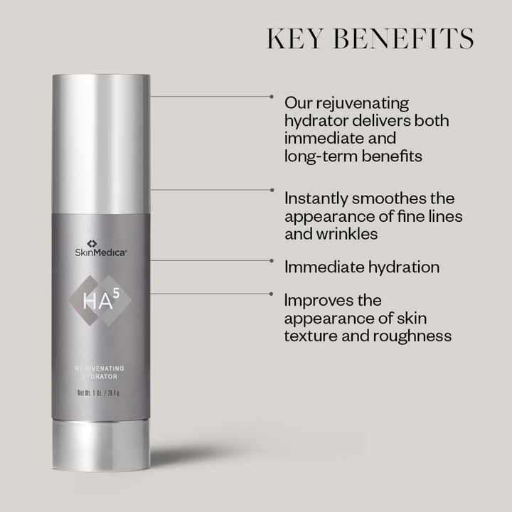 SkinMedica HA5® Rejuvenating Hydrator provides immediate smoothing of fine lines and wrinkles while supporting the skin's natural ability to replenish its own hyaluronic acid for long-term hydration and skin health.